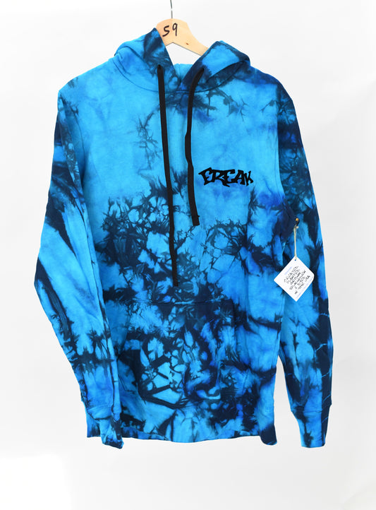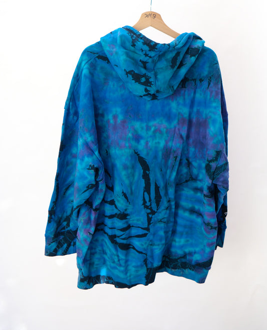 Cotton terry hooded sweater. Hand dyed by Phil Brown. Hand printed by Mikio. Fits a little oversized. Made in the USA.